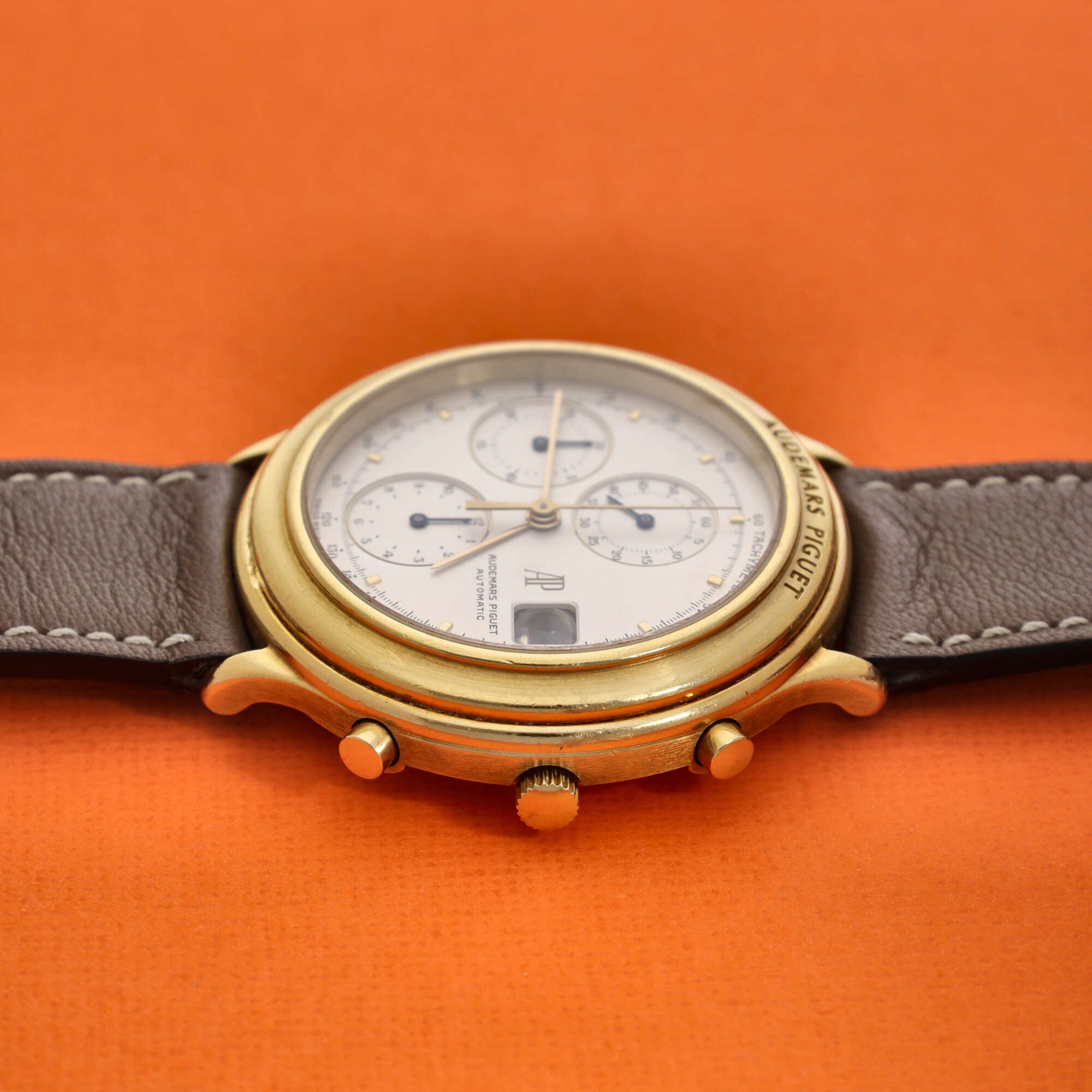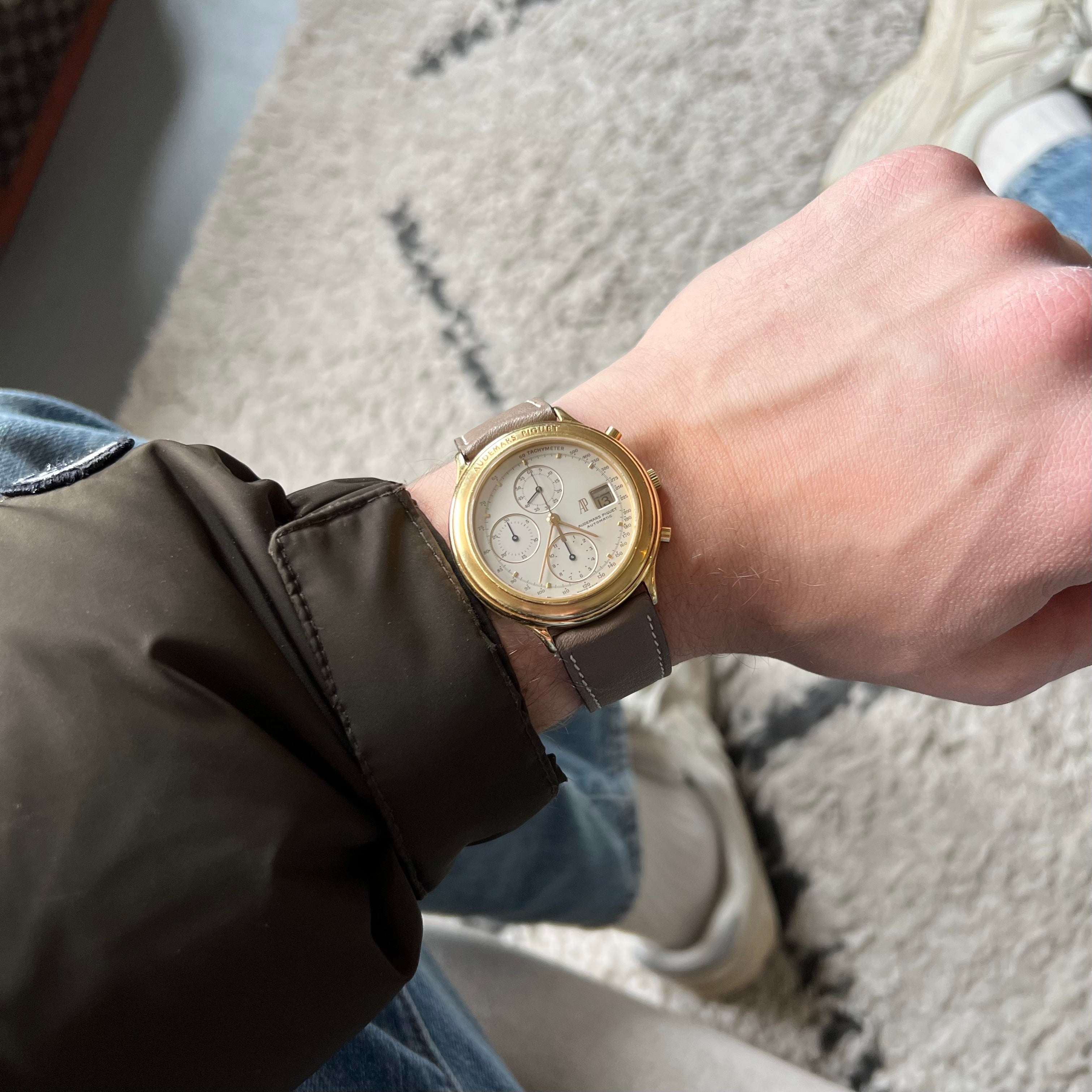 Looking for an Audemars Piguet that literally screams Audemars Piguet? This is the one. The bezel speaks for itself! ☺️ But jokes aside, 18K Yellow Gold AND Chronograph for under 10K.. who would have expected that from an Audemars Piguet? That sentence secretly rhymes. 🤷🏻♂️ Going on... A very unique case, with curves going from the case right into the small lugs, many many curves on this beauty. Topped off with a stunning taupe strap and 18K AP buckle. Surely something you do not see every day! 🙂↔️