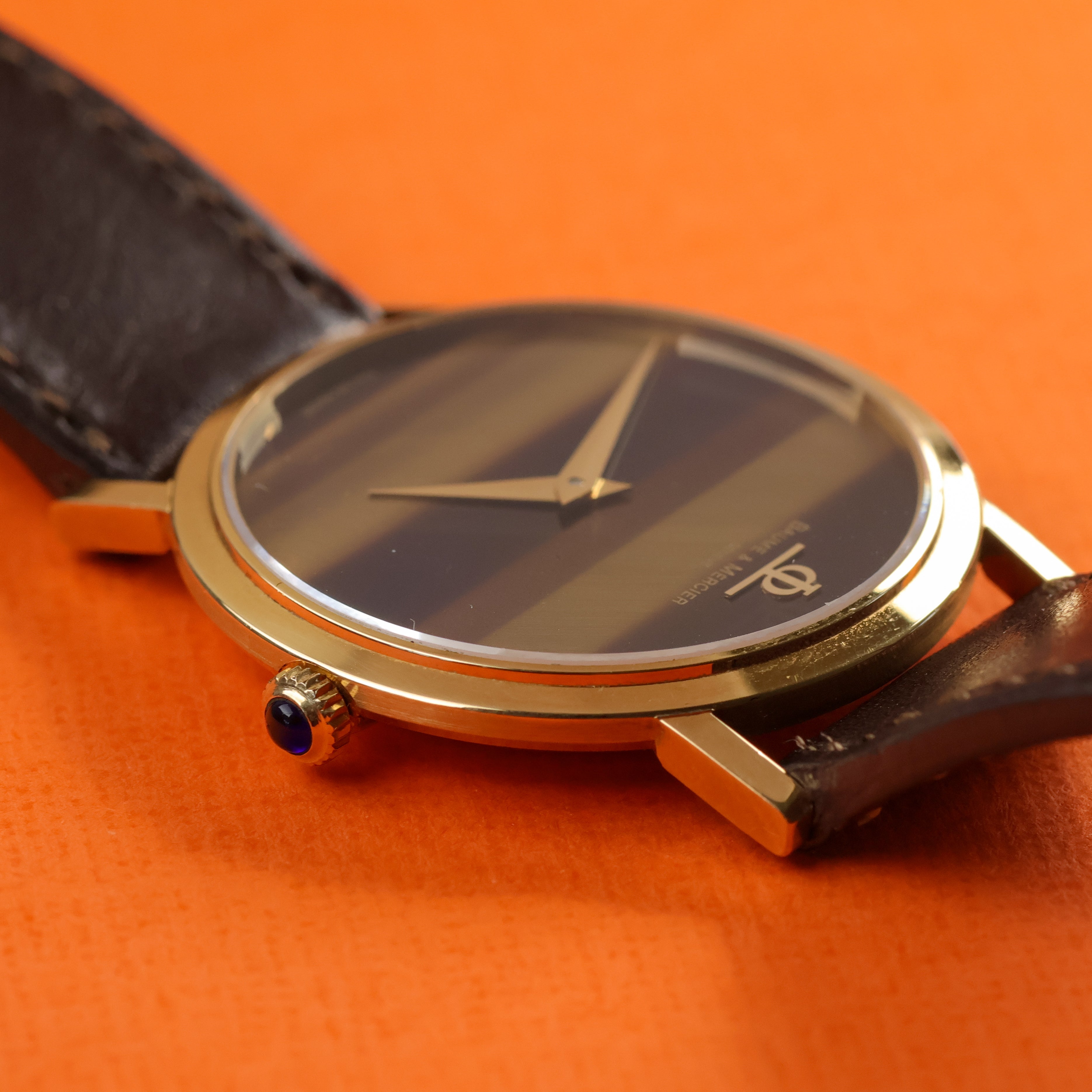 Let me start with the fact that the condition of this watch is just unbelievable. 👀 Often these glossy 18K watches are overpolished, but this one still has VERY sharp lines in the front. From the front to the back 🍑, also on the caseback you can see well pronounced gold stamps and numbers (reference and serial). Even the striped engraving on the outer edge of the caseback is sharp. Then... the showstopper in this watch: the dial. I have already made a video discussing these vintage Baume & Mercier 'stone' dials. They are actually not real natural stone, but painted to closely resemble one. While tilting in the right lighting, it still has all the 'holographic' effects of a real Tiger Eye dial, they really made them so well! Blending the beautiful case and stunning dial, you literally get the perfect dress watch combo. Understated, but with that little touch of 'tiger eye'. Rawr xd. 🐯