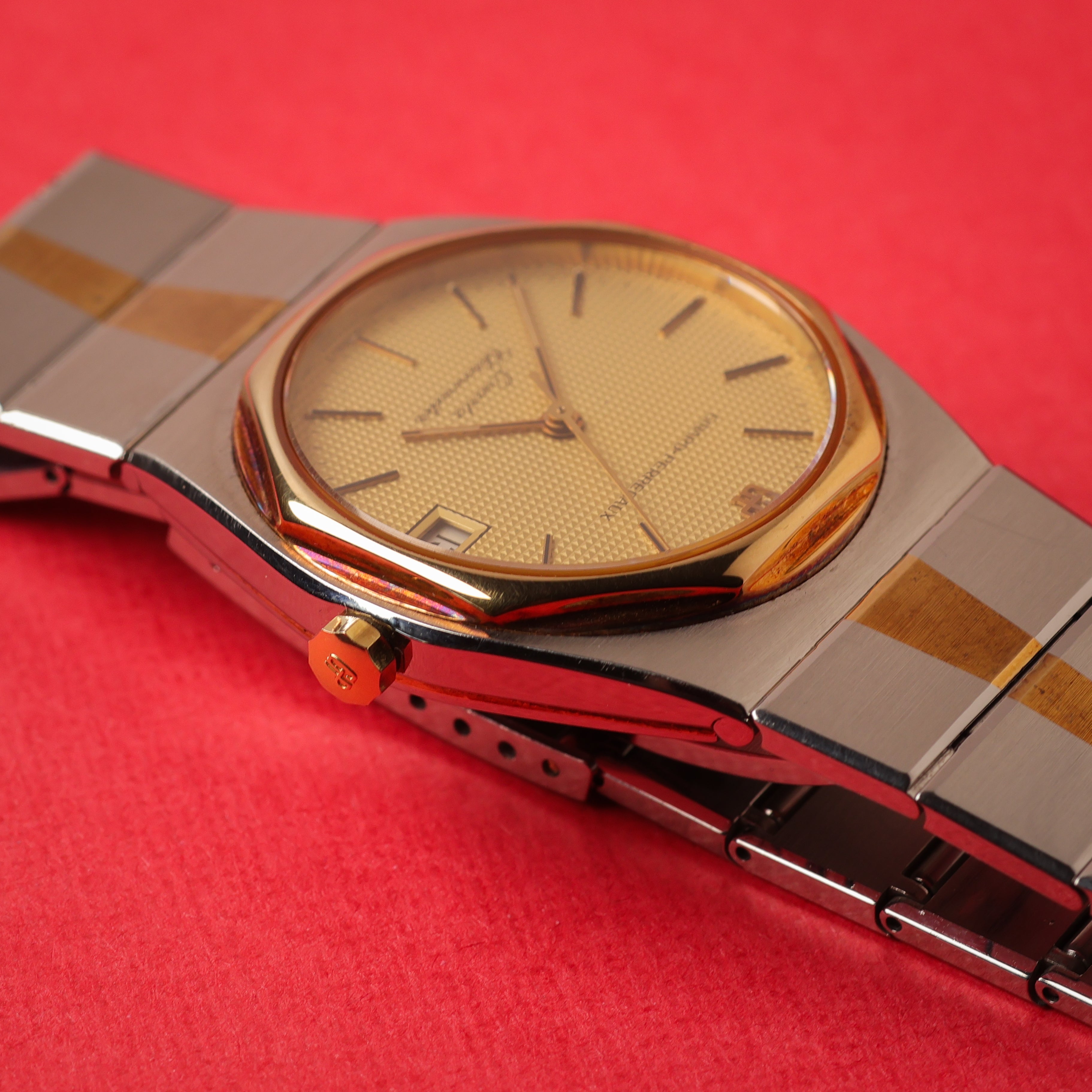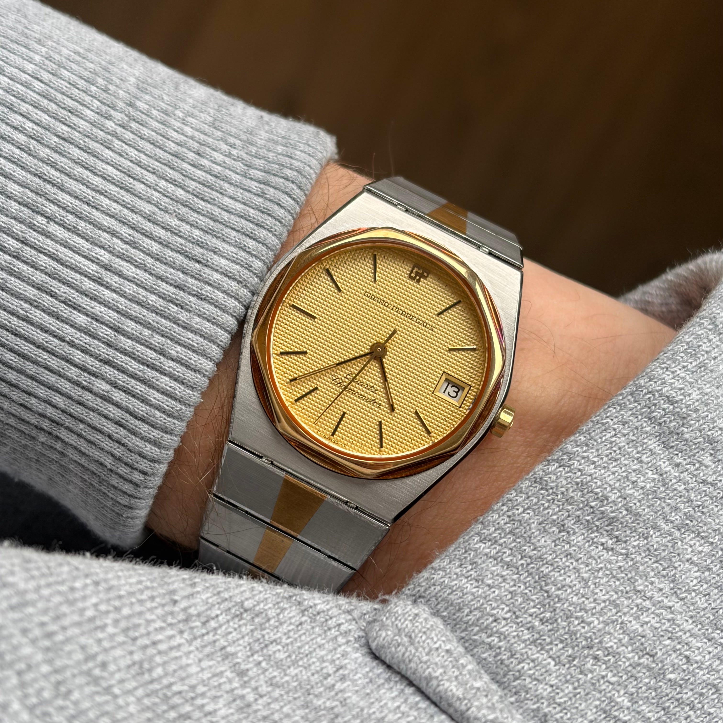 Who does not love a good 1970s design? I know I do! 👀 And this Girard Perregaux Laureato has just that. It has just that and even more... The movement (Caliber 705) was actually quite renewing back in the time, since it was one of the early movements to run on the 32768 quartz Hz frequency still used today. Design and history, all that for a very acceptable price in steel and 14K yellow gold. 😌 For me, the oxidation on this bezel and bracelet really tops it off. I love that the watch shows some age. The bezel has turned almost copper coloured.. Such a warm combination with the detailed clous de Paris dial.. Stunner! 🤌🏻